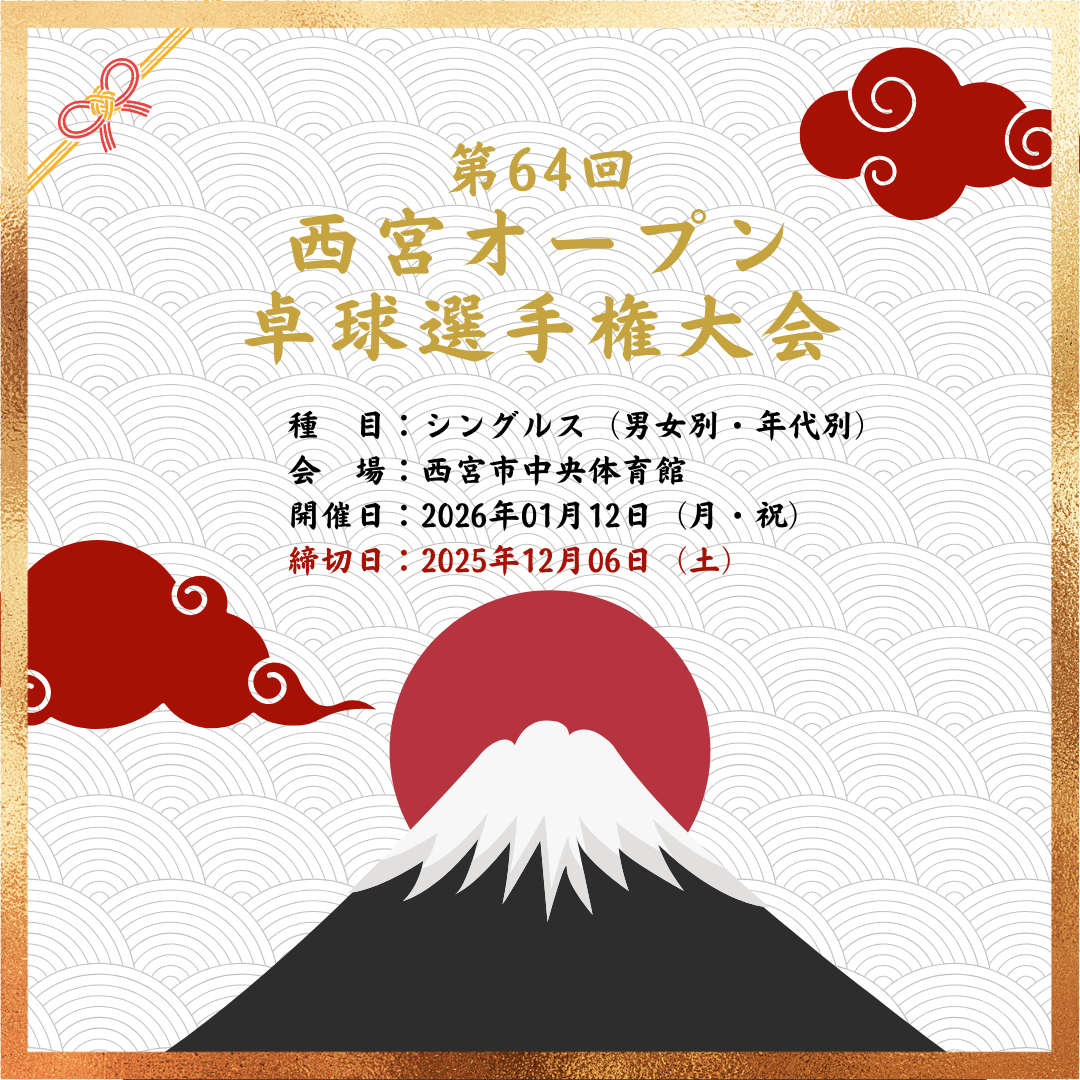 2026/01/12 第64回西宮オープン卓球選手権大会(登録不要)